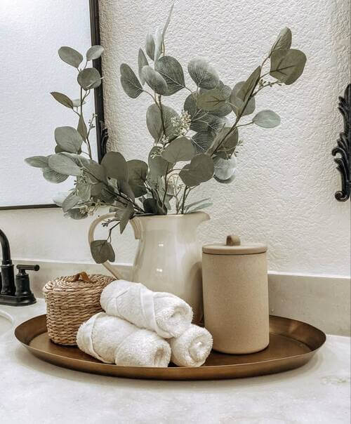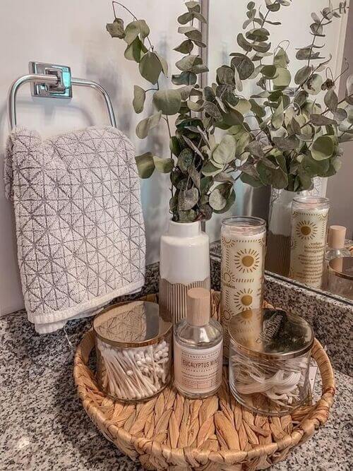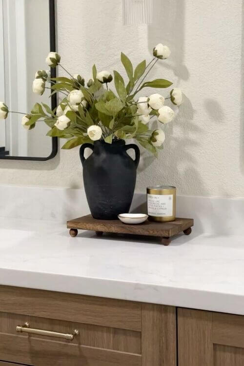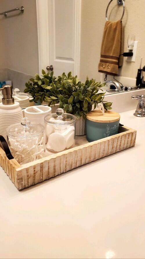 A rustic tray styled with everyday essentials brings warmth and charm to your bathroom countertop.