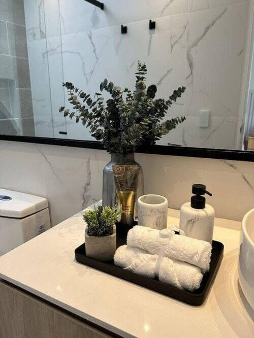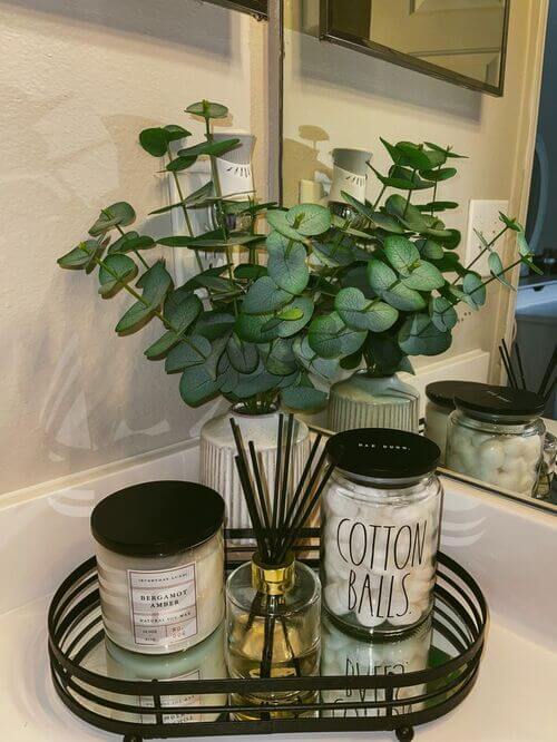 A small candle or reed diffuser near the sink adds a spa-like touch. Keep it compact so it doesn’t crowd the counter.