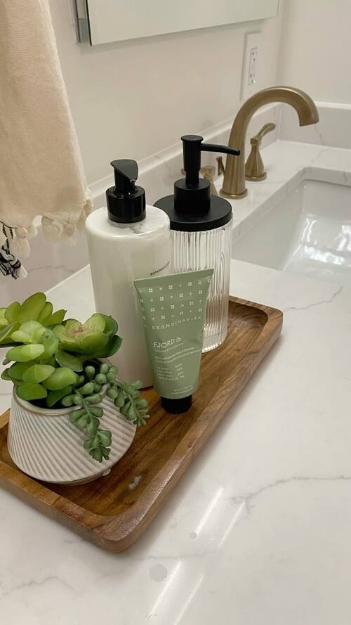 A small tray instantly makes your sink area look organized and intentional. Use it to group everyday essentials like soap and lotion.