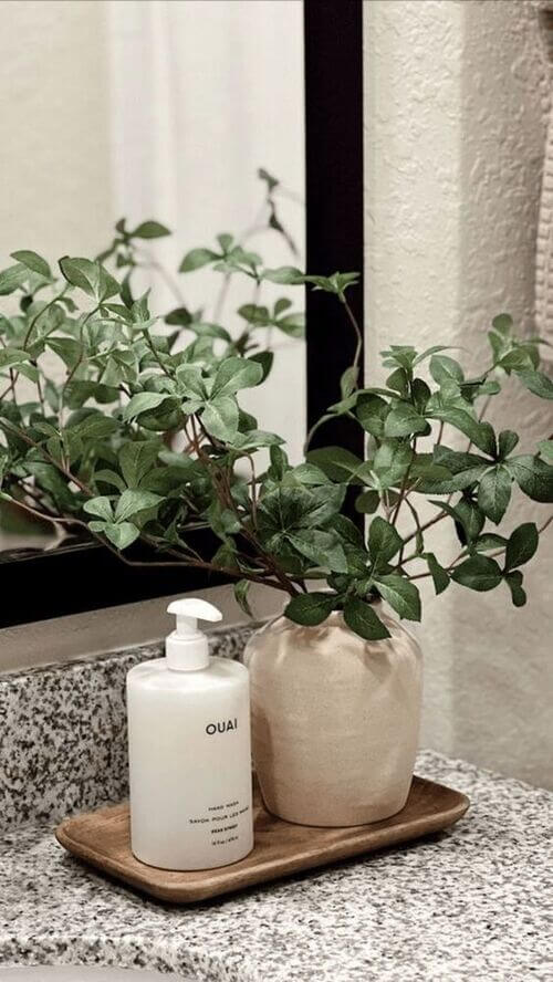 Greenery brings life to your bathroom sink. If you don’t get natural light, faux plants work just as well and stay maintenance-free.