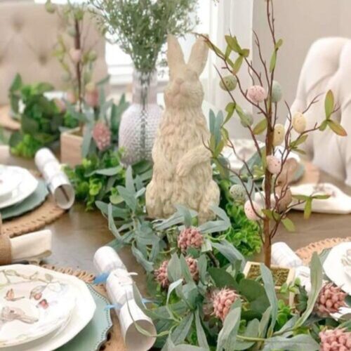 Go for something with fresh greenery, a bird’s nest, or succulents. The bunny in the middle makes this centerpiece look beautiful!