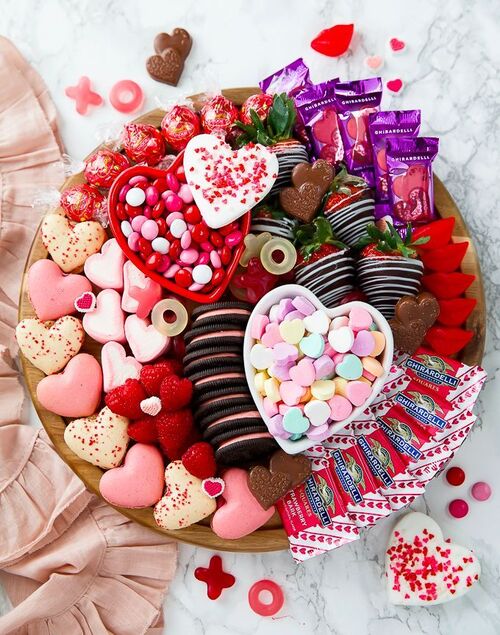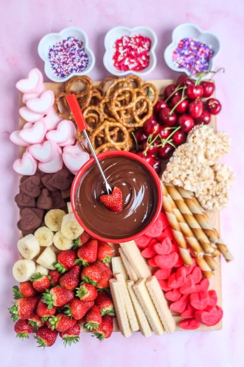Add a small bowl of chocolate fondue in the center and surround it with brownies, pretzels, and chocolate-covered treats for an easy, fun dessert board that’s perfect for girls night or Galentine’s.