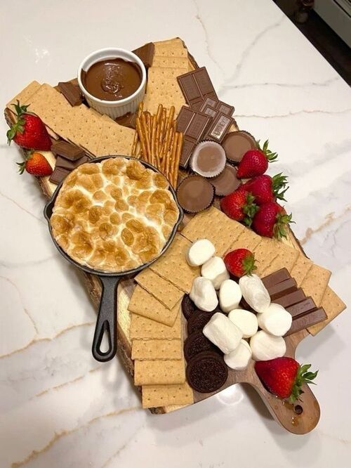 This girl’s night charcuterie board is a fun twist on the classic campfire treat. Load it with graham crackers, chocolate squares, marshmallows, and chocolate-covered treats for dipping.