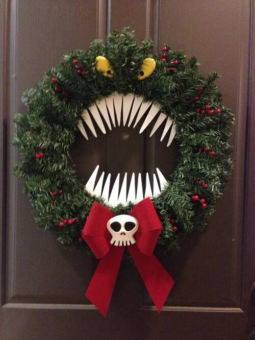 Create a bold monster mouth wreath inspired by The Nightmare Before Christmas by shaping a black foam or grapevine wreath into a wide, toothy grin.