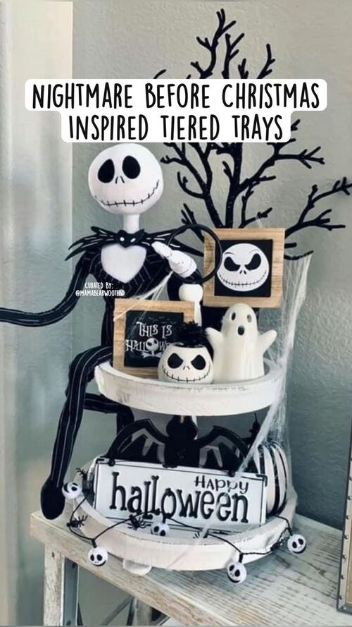 Create a mini Halloween Town on a tiered tray by layering small Jack Skellington, Sally, and Zero figurines with tiny pumpkins, skulls, and faux cobwebs.