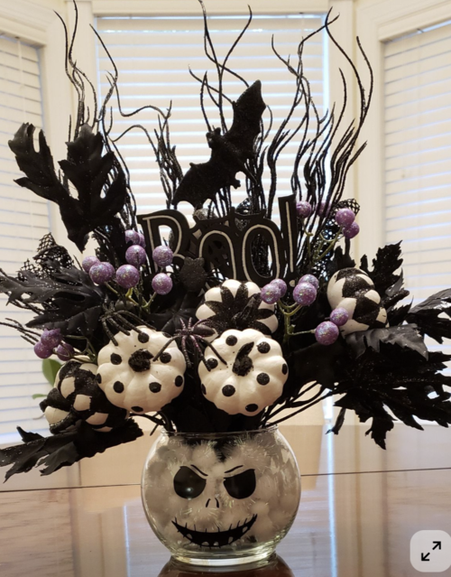 Add a few pops of purple or orange accents for color, and you’ve got a spooky-meets-festive focal point perfect for your dining table or coffee table.