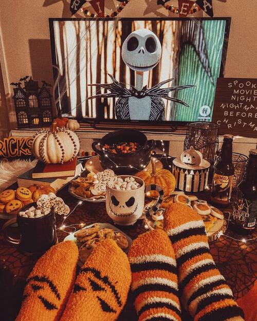 Add string lights, mini pumpkins, and a bowl of themed snacks or popcorn for a spooky yet comfortable setup perfect for watching The Nightmare Before Christmas.