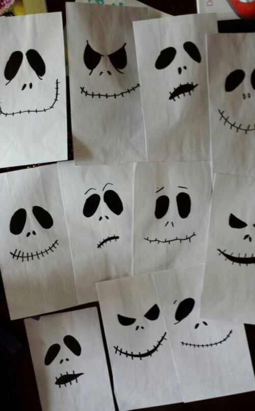 Use white paper bags to create spooky lanterns by drawing different Jack Skellington faces on each bag.