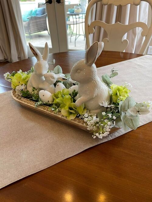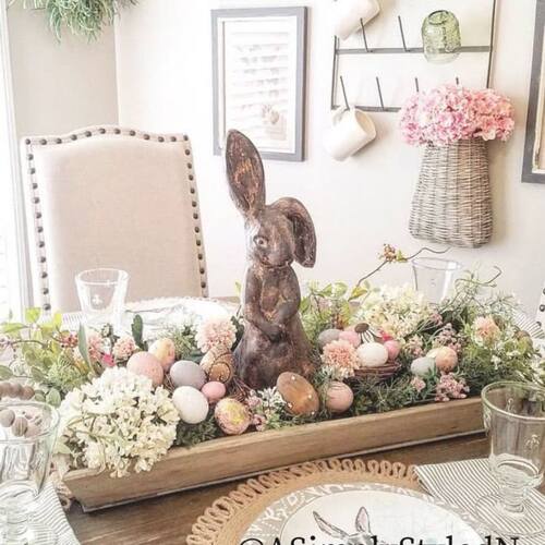 Add a rustic white wooden bunny to complete the look. The combination of natural textures, soft colors, and charming accents creates a simple yet elegant spring centerpiece.