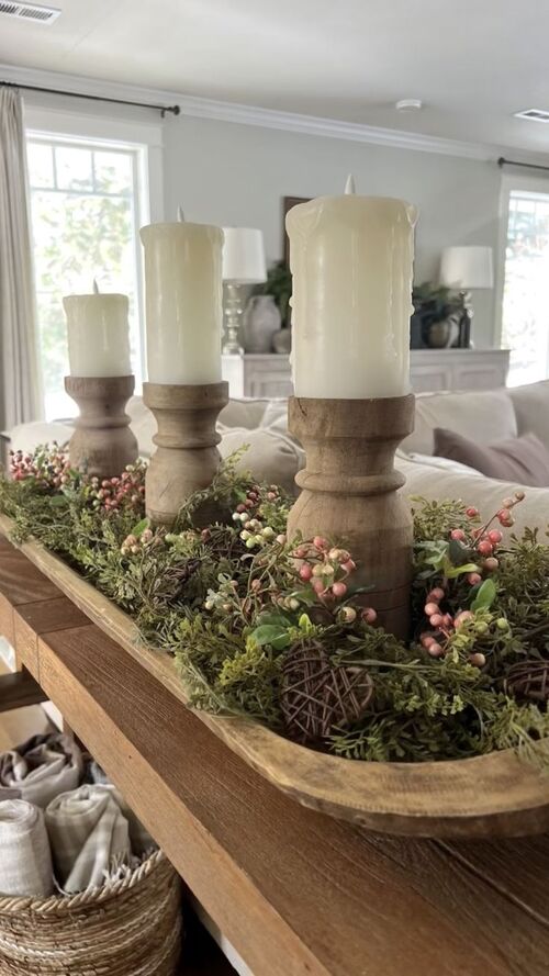 The mix of wood, wax, and greenery creates a soft contrast that works beautifully in farmhouse, modern, or transitional spaces.