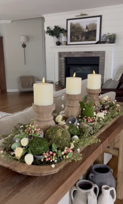 The warm candlelight against earthy greens and rustic wood creates a cozy yet refined spring centerpiece.