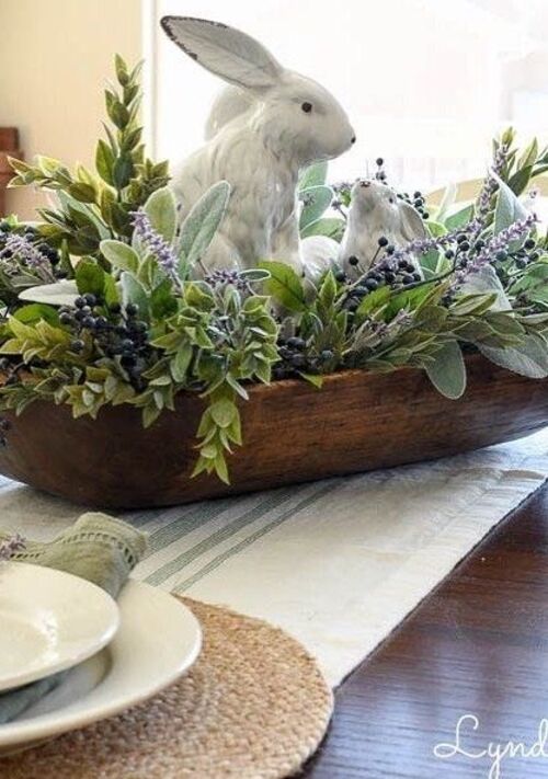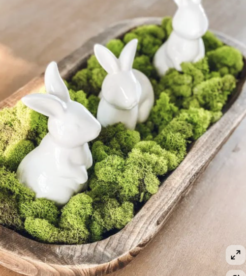 Fill a rustic wooden dough bowl with a loose layer of preserved moss and place one or two white ceramic bunnies on top for a simple, elegant spring look.