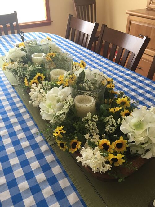 The combination of sunny yellow, natural wood, and lush green feels fresh, balanced, and perfect for a dining table or kitchen island centerpiece.