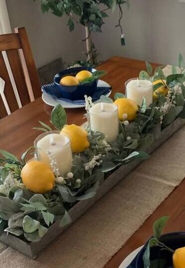 13. Rectangular Dough Bowl with Lemons, Greenery, and Pillar Candles