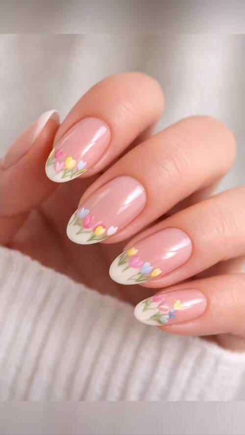 A soft sage or olive green tip gives a more earthy spring vibe compared to pastels.