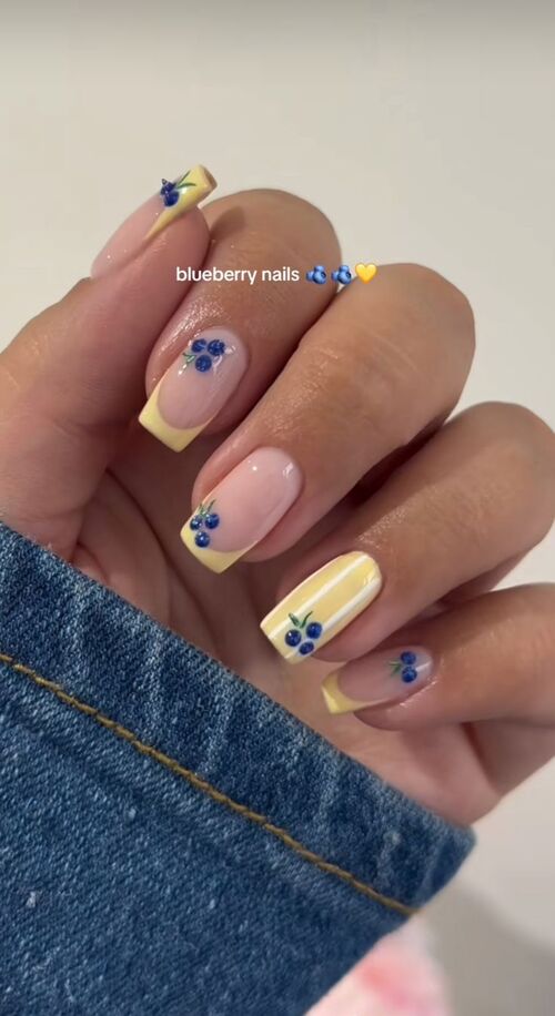 These playful nails feature soft yellow French tips with tiny blueberry accents for a unique spring look.