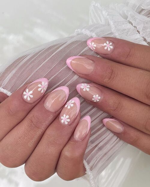Classic pink French tips paired with white daisy details create a timeless spring nail look.