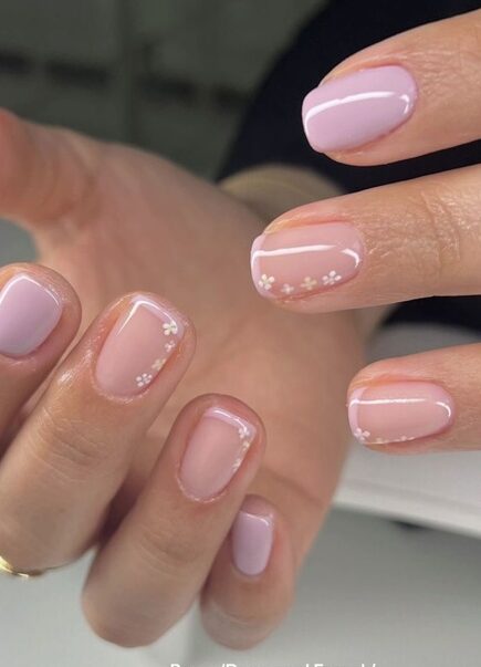 A soft pink ombre base combined with delicate white flowers creates a dreamy and romantic spring manicure.