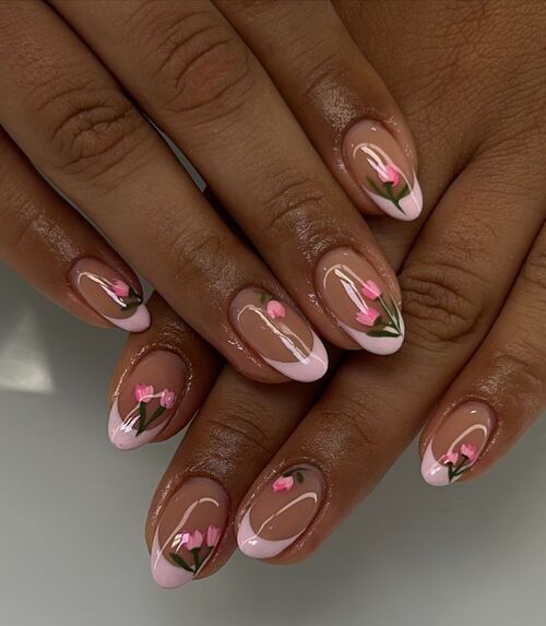 Soft pink French tips with delicate tulip nail art create the perfect spring manicure.
