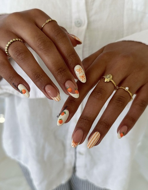 These nails combine soft neutrals with orange floral accents for a fresh and slightly bold spring look.