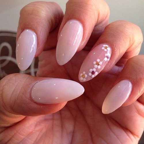 They pair beautifully with gold jewelry and soft outfits. Spice up the clean nails with a little flower design on two nails.