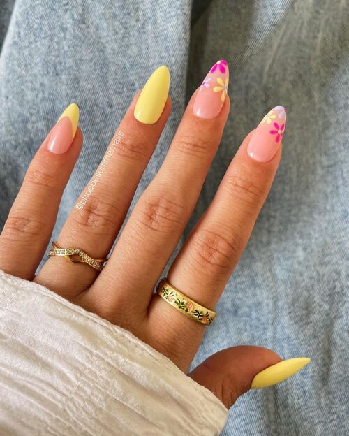 This mix of soft pink and bright yellow with floral accents creates a perfectly balanced spring manicure.
