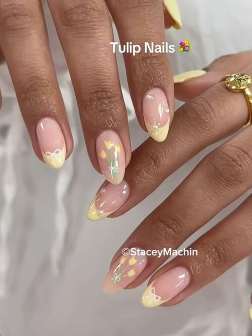 These almond-shaped spring nails feature soft yellow French tips with tulip details for a bright and cheerful look.