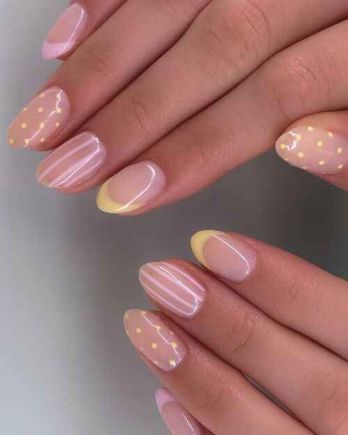 Soft yellow nails paired with small floral details and polka dots create a super fun spring nail design.