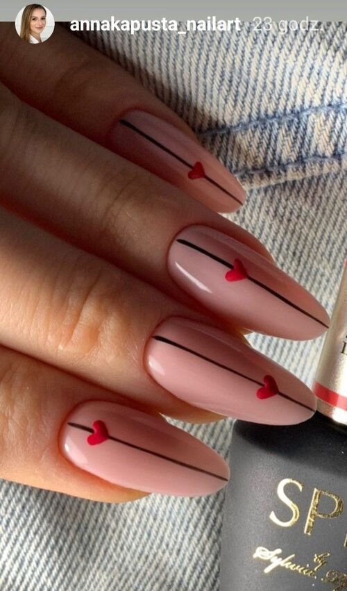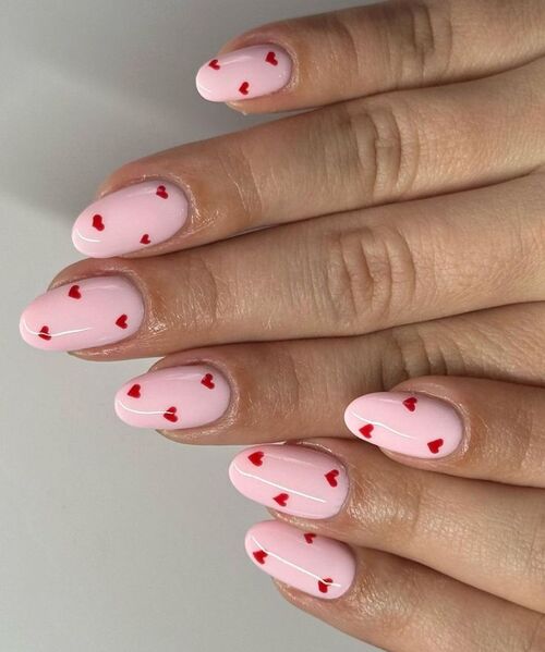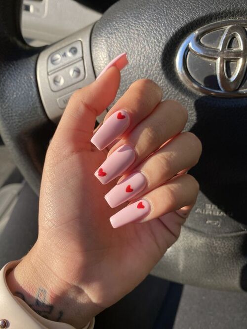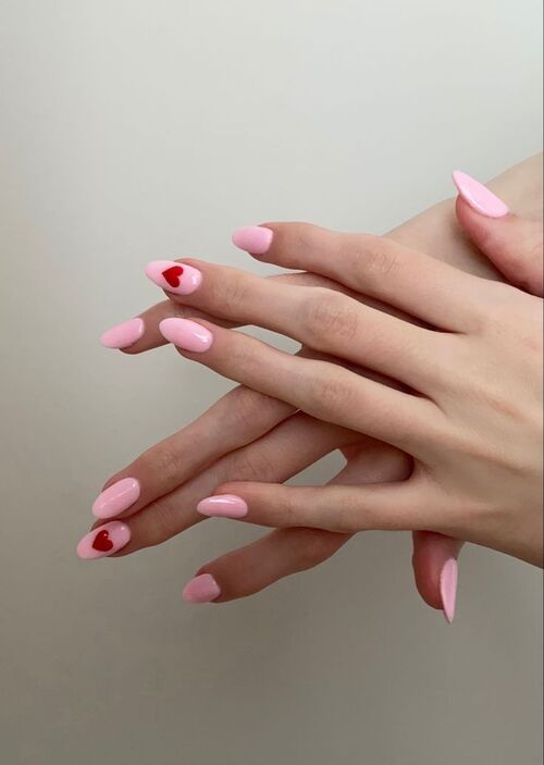 These pink nails are simple and romantic, adorned with tiny red hearts for a cute Valentine’s Day touch.