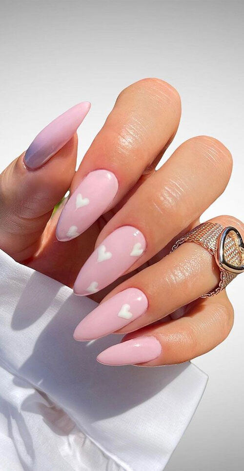 These long almond-shaped nails feature a soft light pink base with delicate white hearts.