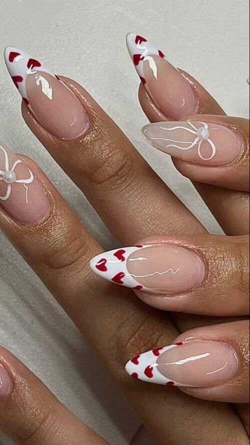 These red and white nails are playful and festive, featuring different Valentine’s Day-themed designs like bows, hearts, and more.