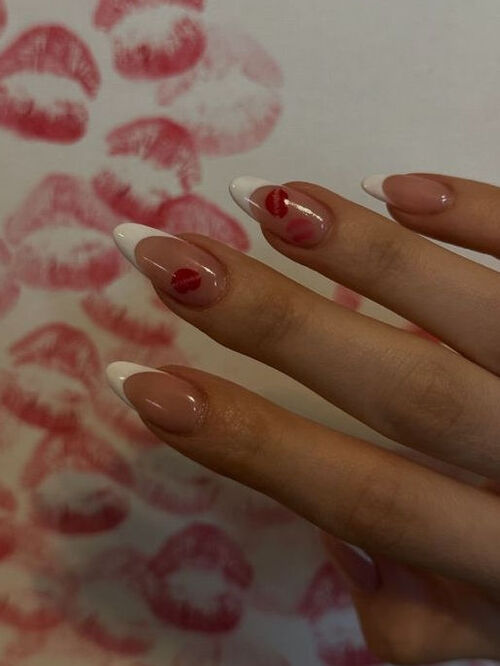 The crisp white tips keep the manicure elegant, while the kiss accents add a fun, flirty touch perfect for February.
