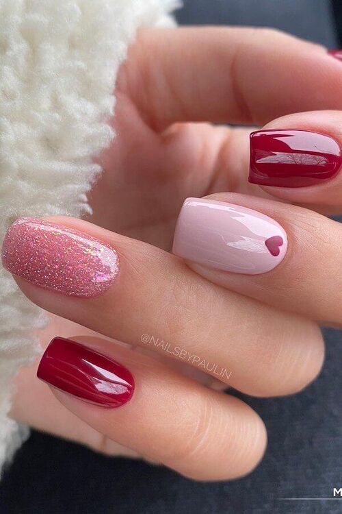 One nail sparkles with glitter, and another features a cute heart design, creating a festive and trendy Valentine’s Day manicure that’s fun yet chic.