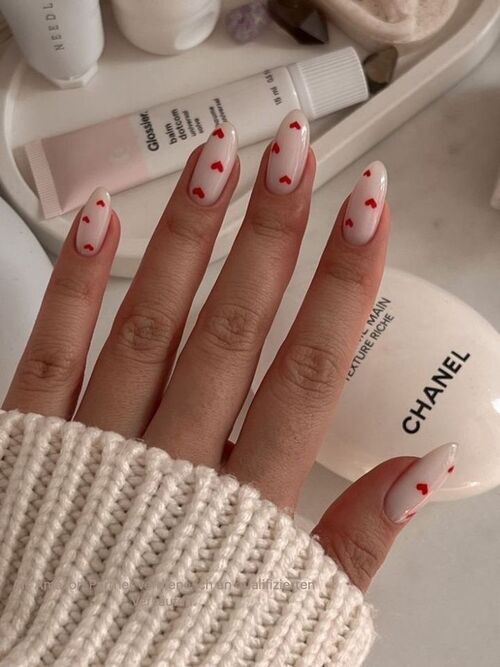 These milky white nails are soft and elegant, accented with tiny red hearts for a subtle Valentine’s Day vibe.