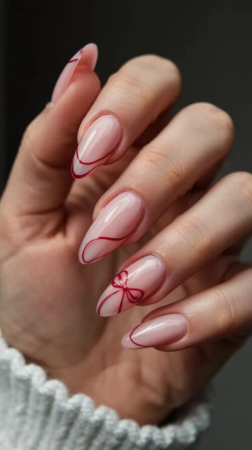 These nude nails feature sleek, swirly red bows for a chic and romantic Valentine’s Day look.