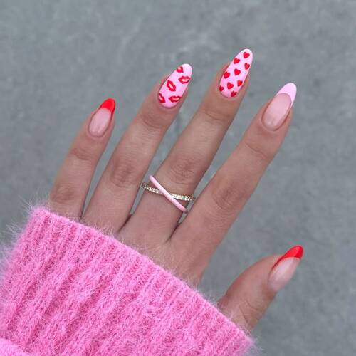 These pink Valentine’s Day nails mix hearts, kisses, and French tips in different shades of pink for a fun but cohesive look.
