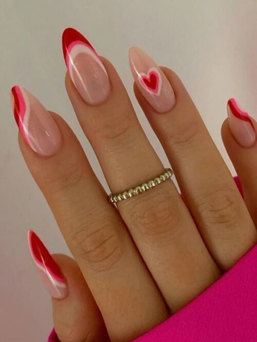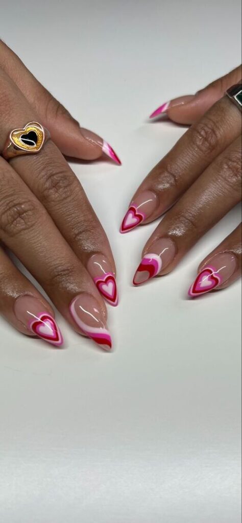 These almond-shaped nails feature a heart-shaped tip in rainbow colors, creating a playful and vibrant Valentine’s Day manicure.