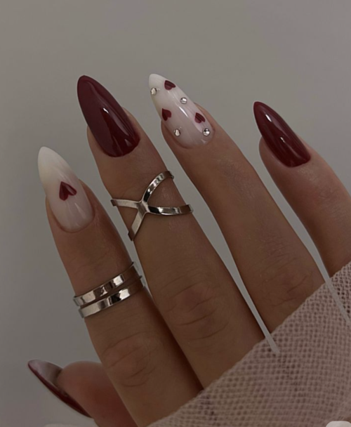 White French tips and delicate white heart details on a few fingers add a subtle Valentine’s Day touch while keeping the look sleek and minimal.