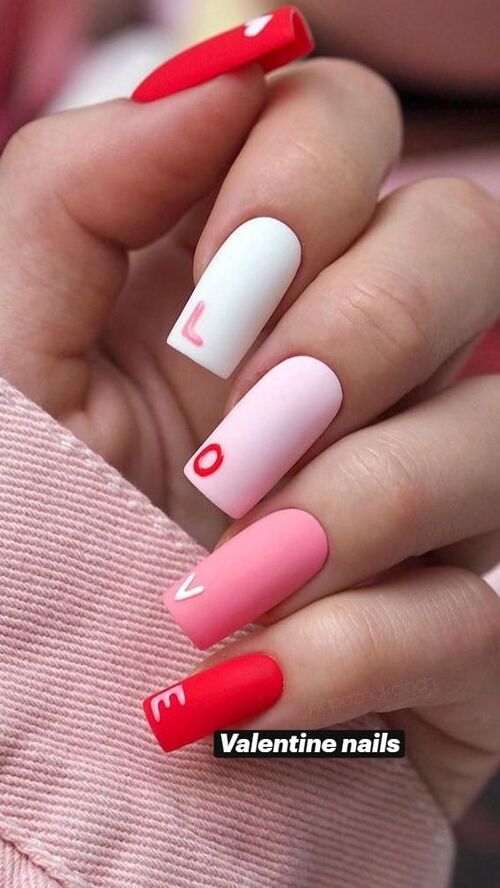 Each nail features a different romantic shade and a letter from the word LOVE, creating a fun, eye-catching Valentine’s Day manicure that’s playful yet chic.