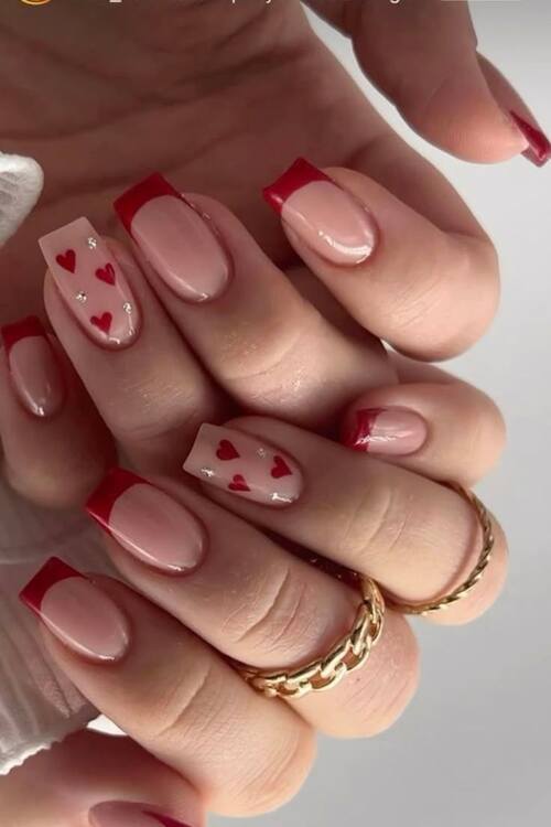 15. Red & Nude Valentine’s Nails with Sparkle Heart Accent