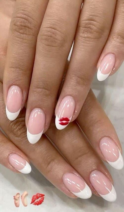 Classic French tip nails with a single kiss accent are timeless, clean, and subtly romantic.