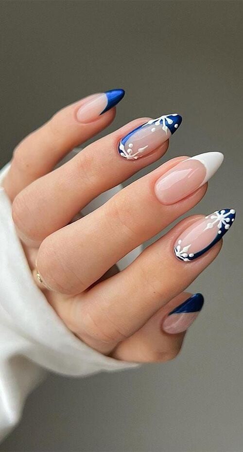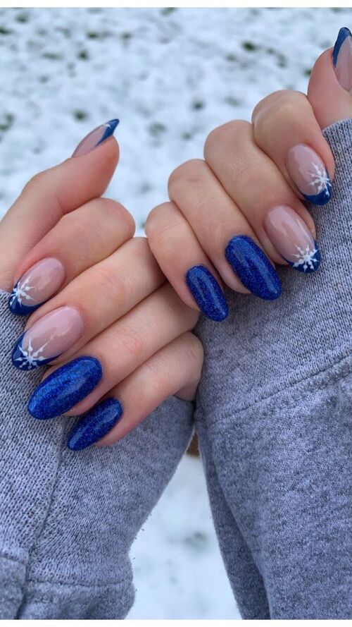Deep navy nails bring a rich, wintery vibe, while alternating French tips in the same shade add a modern twist.