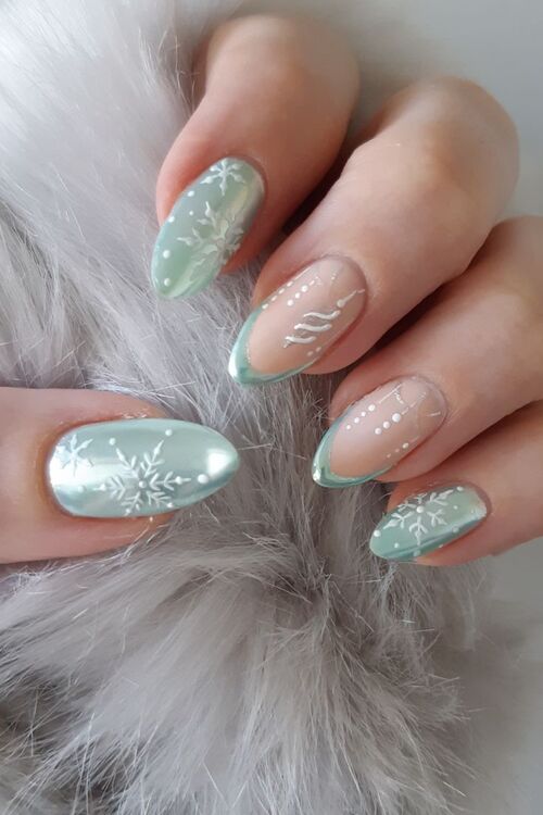 Fresh and frosty, mint chrome nails with white star accents bring a cool, dreamy vibe to winter.