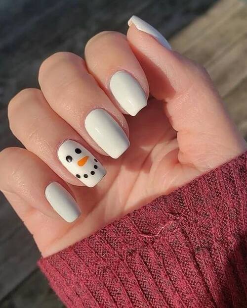 Crisp white nails get a playful winter twist with a single snowman accent.