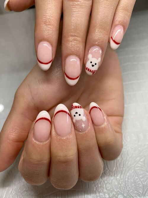 2. White and Red Lined French Tips with Teddy Bear Design