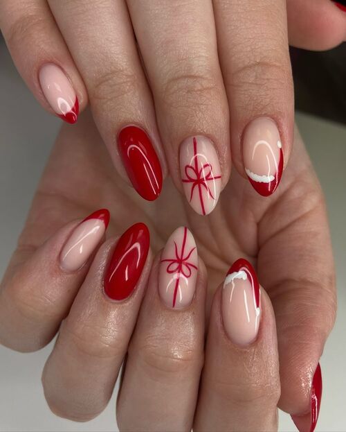 This sweet, festive manicure combines classic nude French tips with tiny red bows for a playful holiday touch.