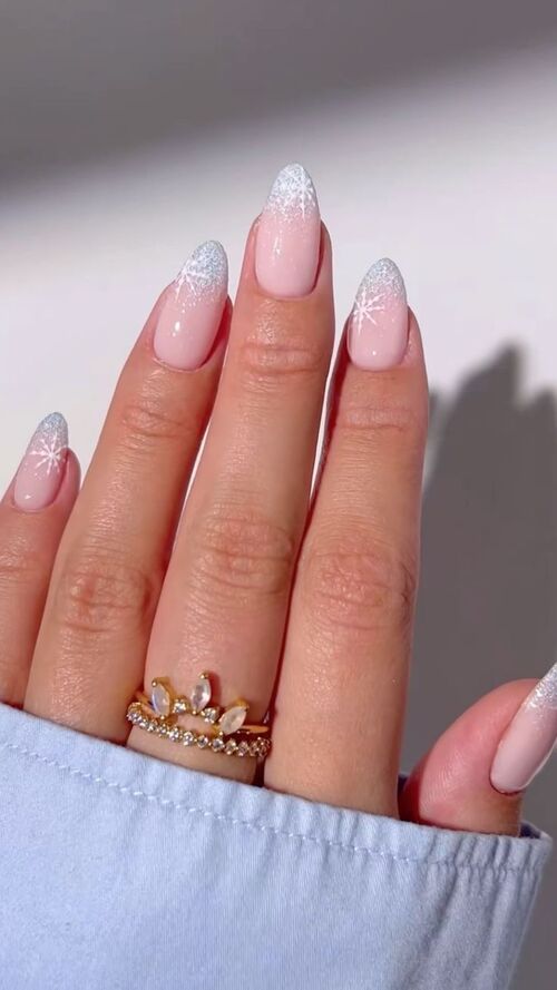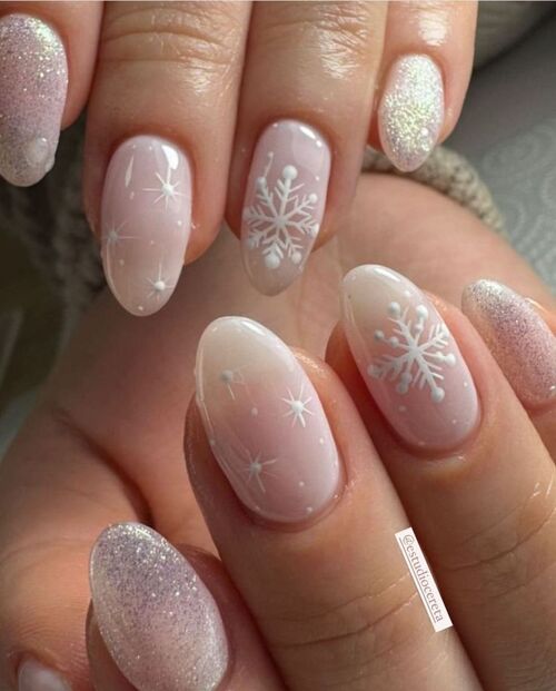 Soft pink nails adorned with tiny snowflakes strike the perfect balance between feminine and festive.
