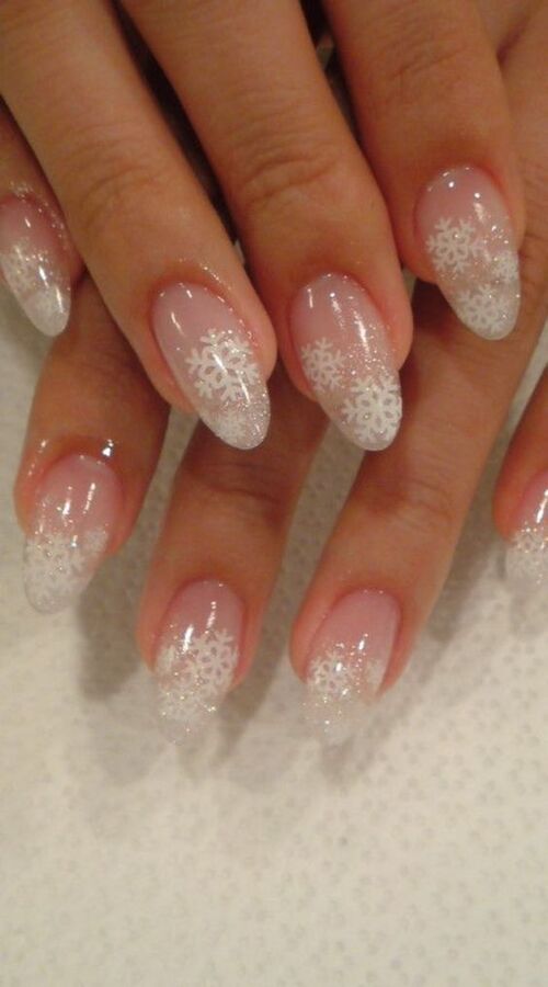 23. Sheer Pink Nails with Snowflakes