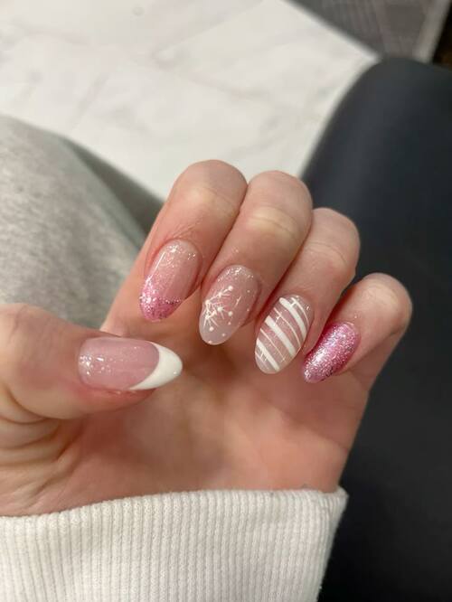 Soft pink nails get a fun twist with a different design on each finger, from glitter and white swirls to delicate stars.