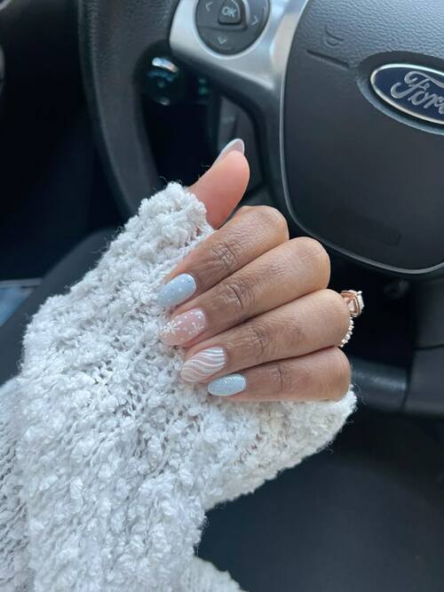 Soft light blue and nude nails combine for a serene, winter-inspired look.